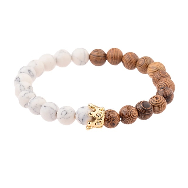 Popis: Stylový módní pánský i dámský náramek Královská korunka vyrobený z hnědých a bílých korálků a doplněný zlatou královskou korunou.