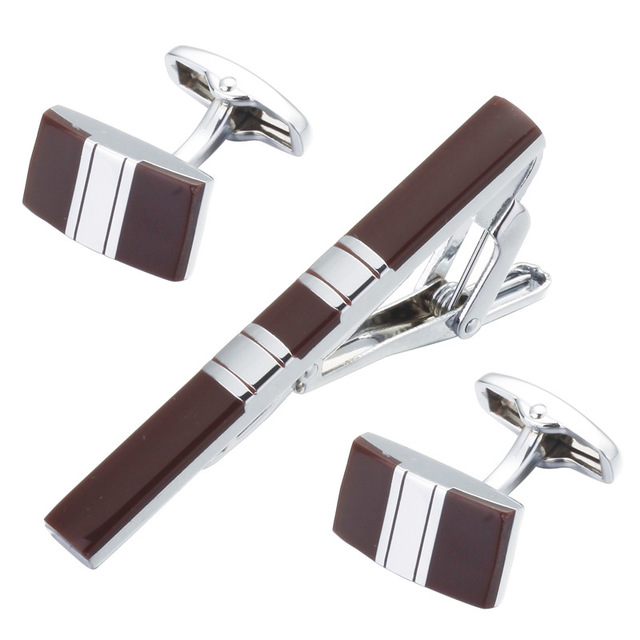 Popis: Luxusní hnědo - stříbrný set složený ze spony na kravatu a manžetových knoflíčků v designu Stripe je stylovou třešničkou vašeho outfitu.