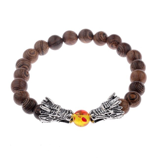 Popis: Stylový módní pánský náramek Dračí hlavy vyrobený ze dřeva a doplněné stříbrnými dračími hlavami, které plivou ohnivou kouli.