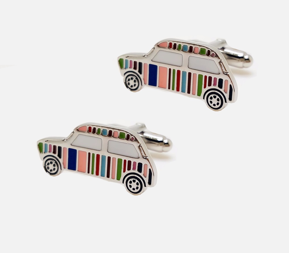 Popis: Manžetové knoflíčky automobil Mini s barevnými pruhy jsou skvělým módním doplňkem pro všechny majitele a fanoušky kultovní anglické automobilové značky Mini.