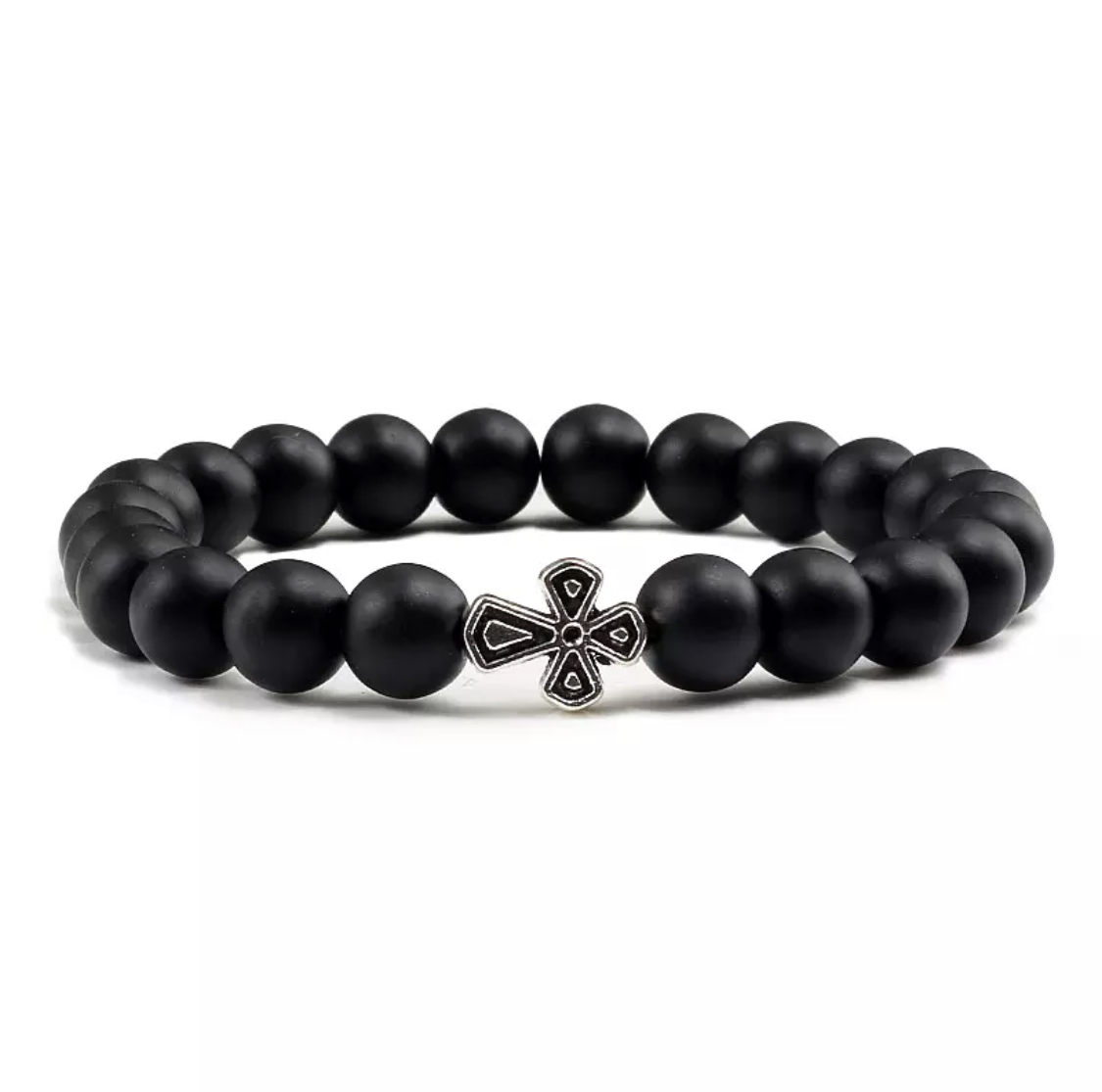 Popis: Stylový módní pánský a dámský náramek Velký náboženský kříž vyrobený z matných černých korálků a doplněný stříbrným křížem.