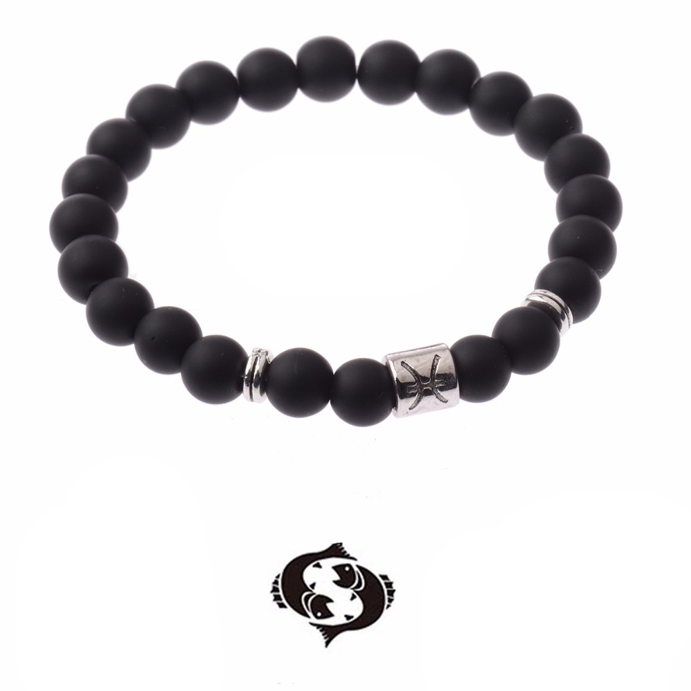 Popis: Luxusní módní unisex náramek znamení Zvěrokruhu - Ryby, který je vyrobený z matně černých achátových kamenů, doplněný stříbrnými fragmenty.