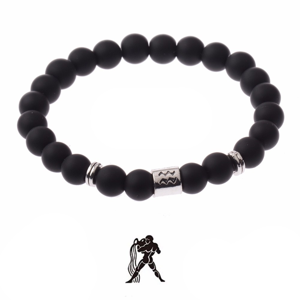 Popis: Luxusní módní unisex náramek znamení Zvěrokruhu - Vodnáře, který je vyrobený z matně černých achátových kamenů, doplněný stříbrnými fragmenty.