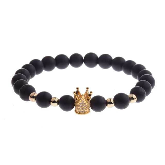Popis: Stylový módní pánský náramek Královská koruna vyrobený z matně černých korálků a doplněný zlatou královskou korunou s krystaly.