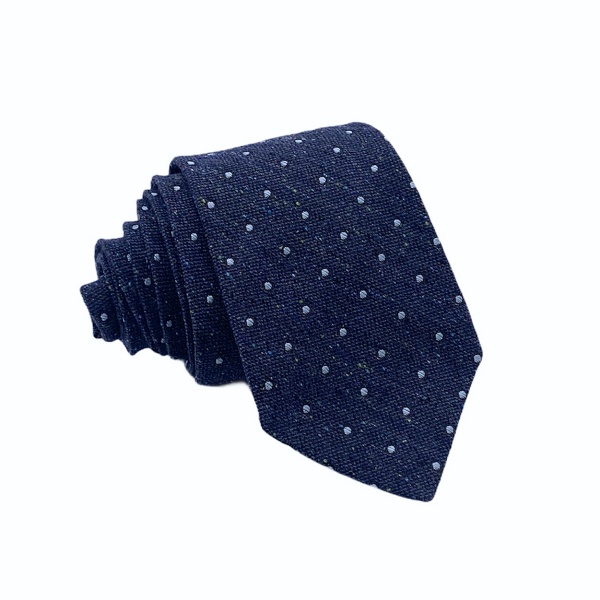 Motiv na kravatě tvoří světle modré puntíčky.