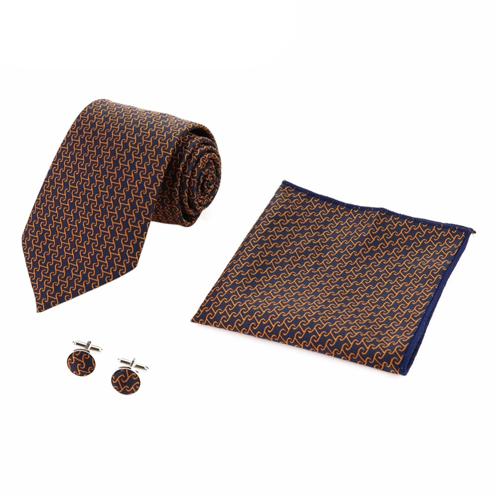 Popis: Stylový módní pánský set v jednotném designu kravaty, kapesníku do kapsy saka a manžetových knoflíčků.