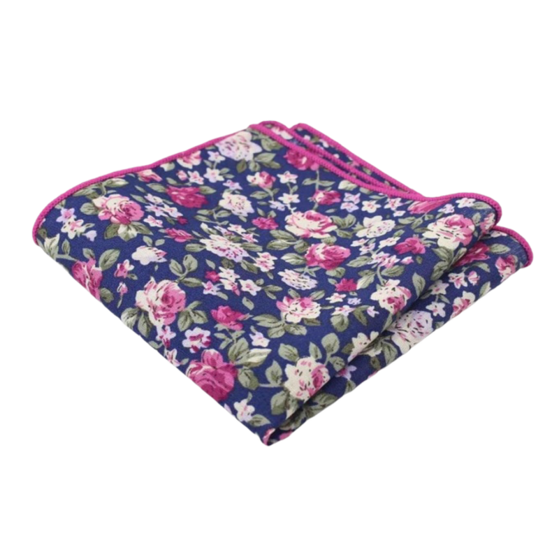 Modrý bavlněný kapesníček je potištěn barevnými růžemi.