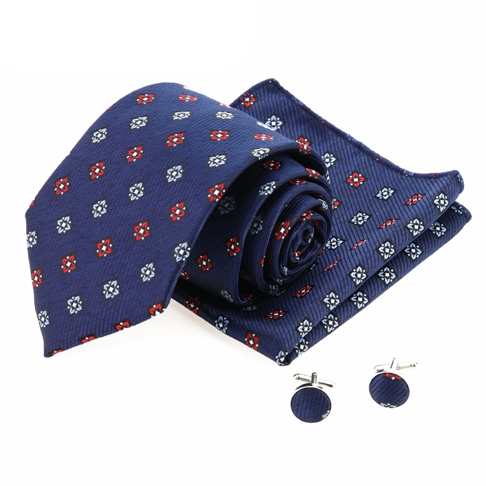 Popis: Stylový módní pánský set v jednotném designu kravaty, kapesníku do kapsy saka a manžetových knoflíčků.