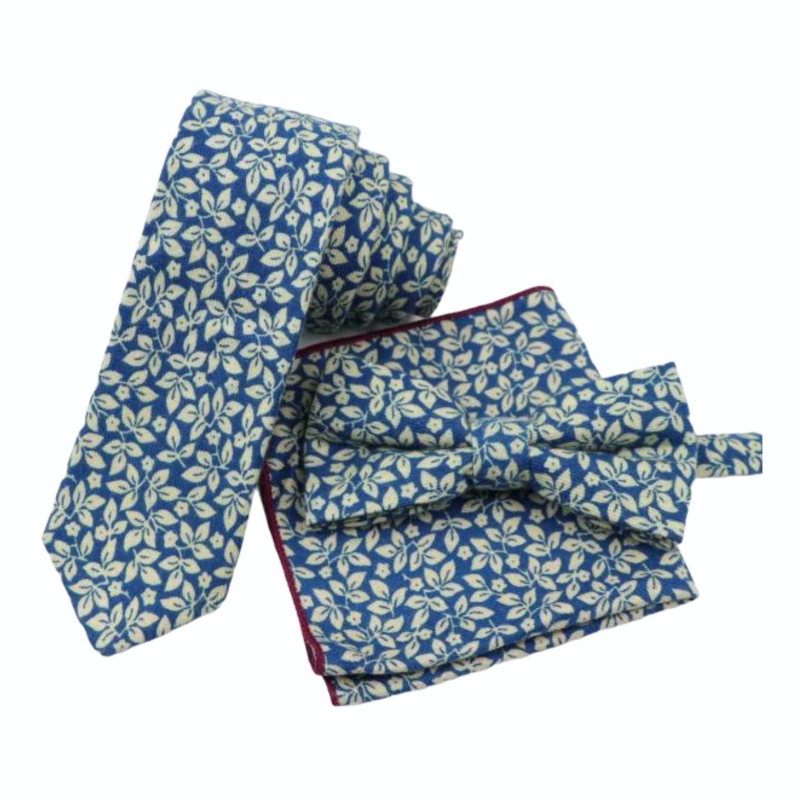 Modrý set kravata, motýlek a kapesník Listy