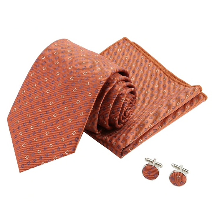 Popis: Stylový módní pánský set v jednotném designu kravaty, kapesníku do kapsy saka a manžetových knoflíčků.