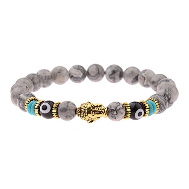 Popis: Stylový módní pánský i dámský náramek Buddha Etnic vyrobený z šeduch korálků a doplněný zlatou hlavou buddhy.