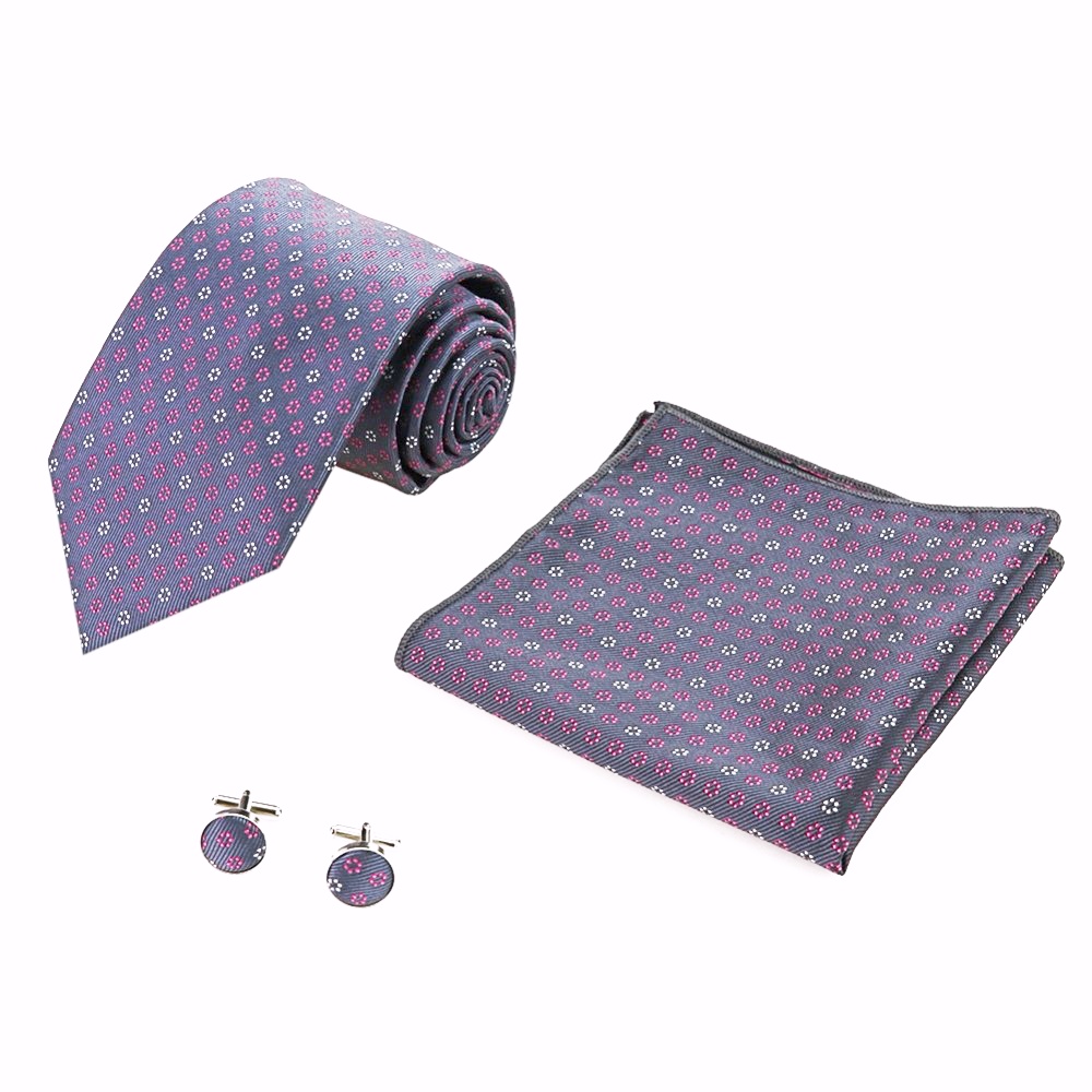 Popis: Stylový módní pánský set v jednotném designu kravaty, kapesníku do kapsy saka a manžetových knoflíčků.