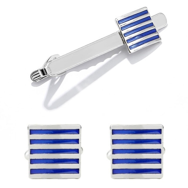 Popis: Luxusní set složený ze spony na kravatu a manžetových knoflíčků v designu modrých Pruhů je stylovou třešničkou vašeho outfitu.