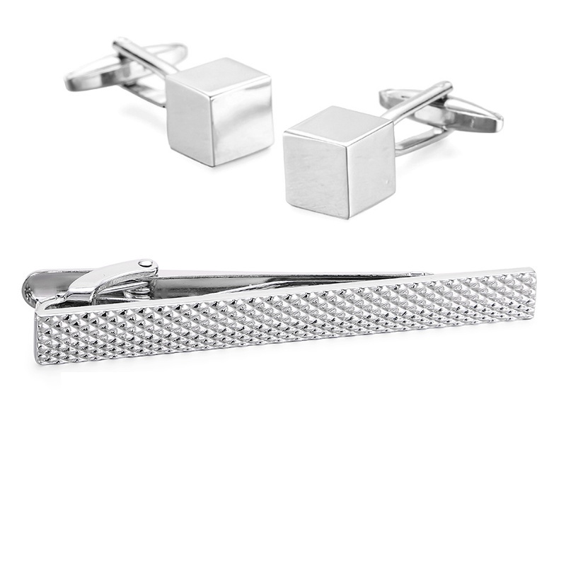Popis: Stylový módní pánský stříbrný set složený ze spony na kravatu v designu geometric a manžetových knoflíčků v podobě kostky je oživením Vašeho outfitu.