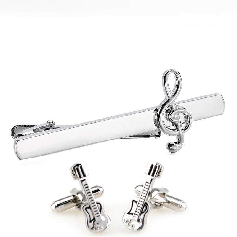 Popis: Stylový módní pánský stříbrný set složený ze spony na kravatu a manžetových knoflíčků v designu houslového klíče a elektronické kytary je oživením Vašeho outfitu.