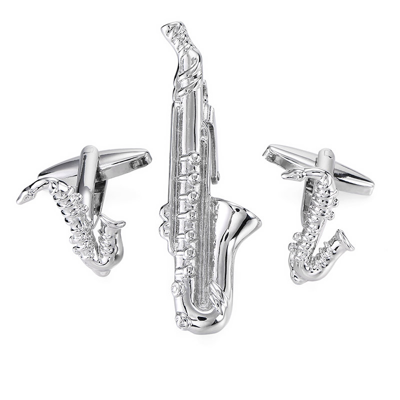 Popis: Stylový módní pánský stříbrný set složený ze spony na kravatu a manžetových knoflíčků v designu saxofonu je oživením Vašeho outfitu.