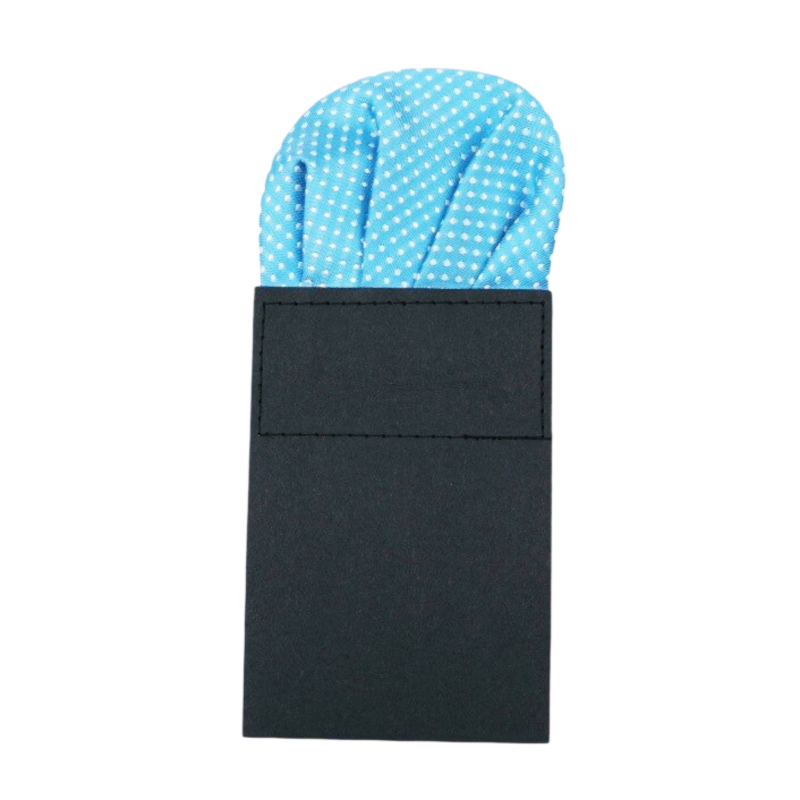 Popis: Stylový již složený a naaranžovaný tyrkysový kapesník do kapsičky saka s bílými puntíčky.