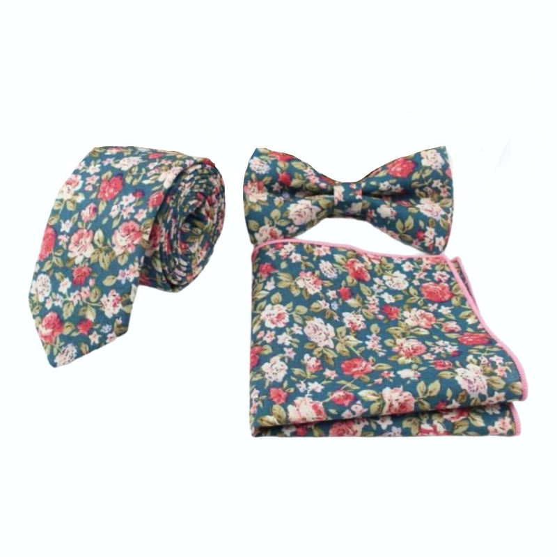 Zelený set kravata, motýlek a kapesník Květiny