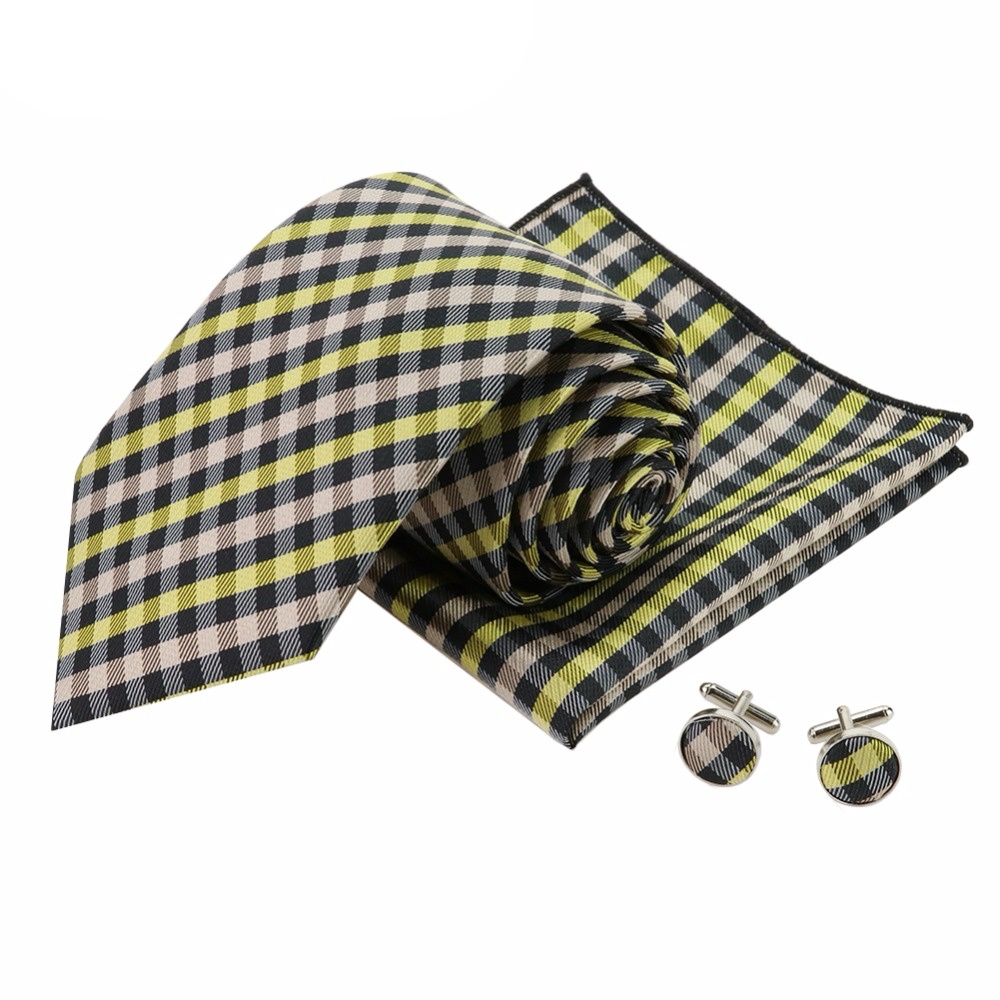 Žluto - béžovo - černý set kravata, kapesník a manžetové knoflíčky KostičkySkladem 1 set749 Kč/ set