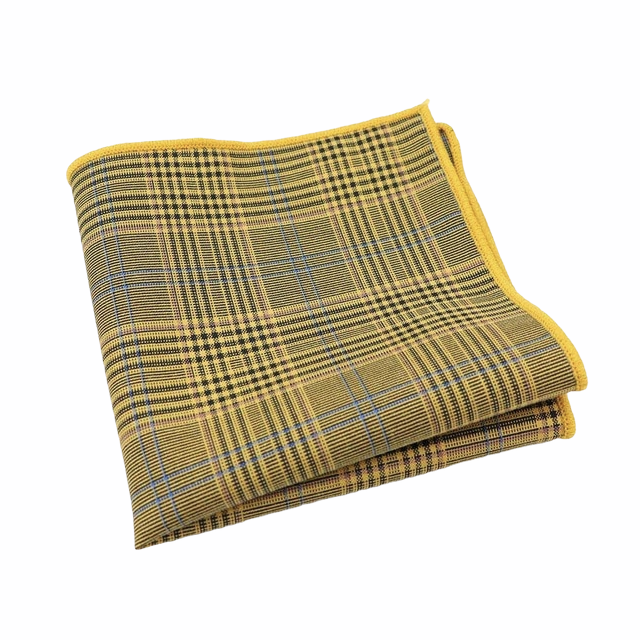 Vyšperkujte svůj dokonalý outfit moderního gentlemana o stylový žlutý kapesníček do saka Plaid, který má černo - modré linky uspořádané do čtvercového vzoru.