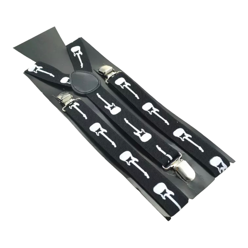 Popis: Oblečte drsný černý rockerský outfit, ve kterém nesmí chybět stylové kšandy s potištěnými kytarami.