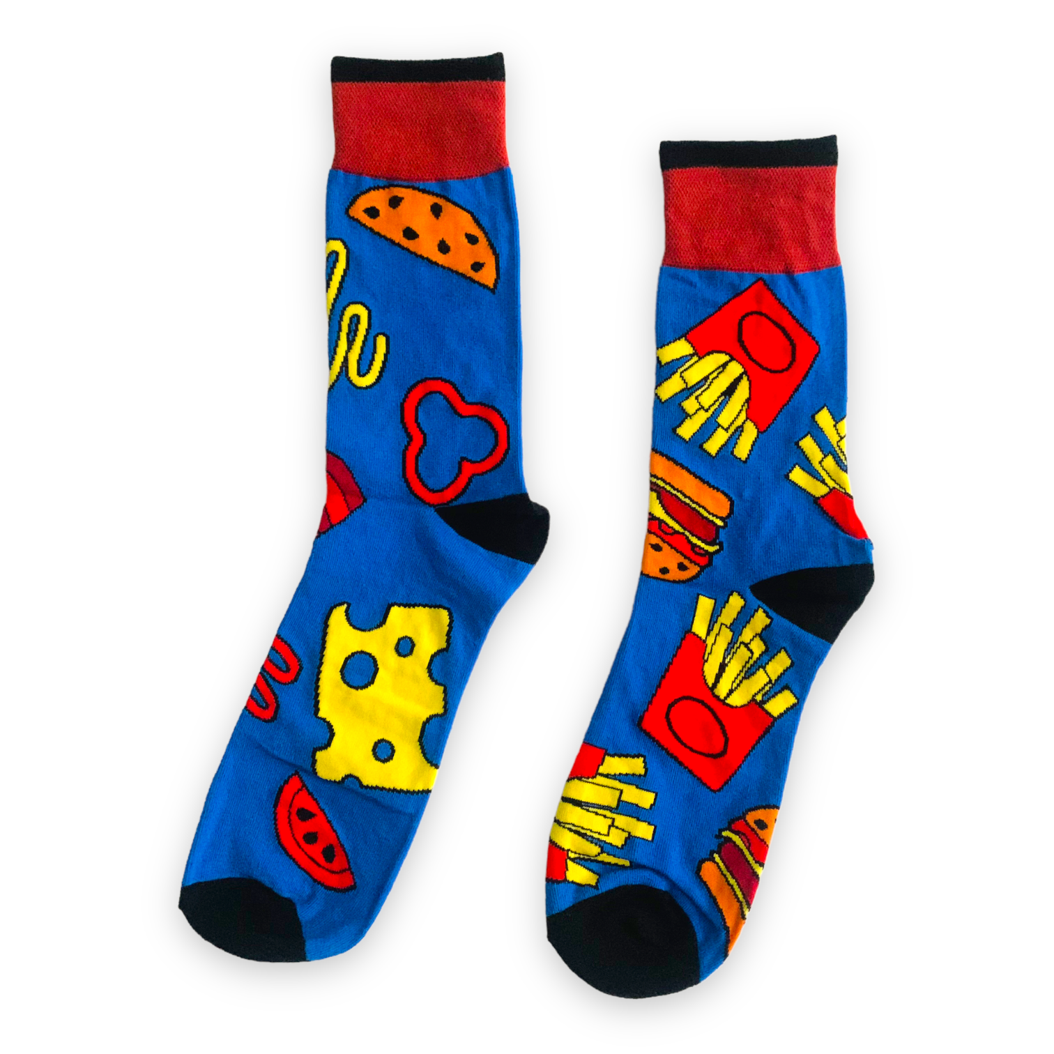 Popis: Modré ponožky s motivem hamburgeru a hranolků přinesou do vašeho šatníku hravost a originalitu. Vyrobené z měkkého, prodyšného materiálu, skvěle drží tvar a pohodlně se nosí. Perfektní volba pro ty, kdo milují veselé a nápadité ponožky.