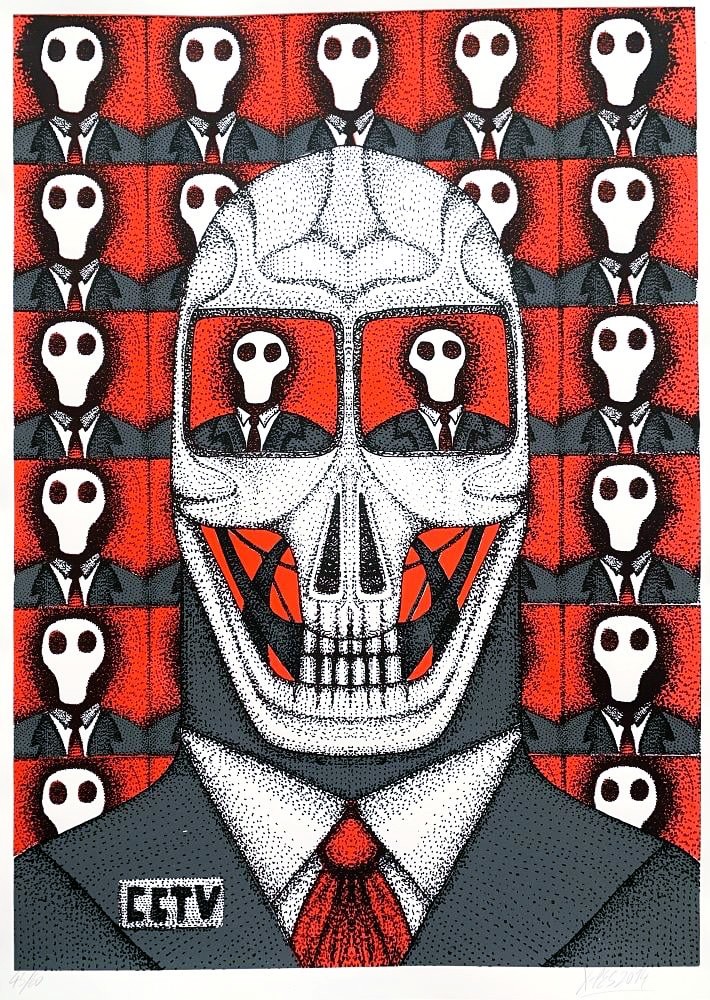Popis: Originální vintage sítotisk s názvem CCTV. Motiv lebky, která vystupuje na televizní obrazovce. Tisk bude dělat každodenní radost při pohledu na něj, ale také se jedná o skvělou investici. Ondřej Vyhnánek patří do silné generace umělců (Pasta Oner, Michal Škapa, Jan Kaláb a dalších), kteří přešli z ulice do galerijního prostoru.